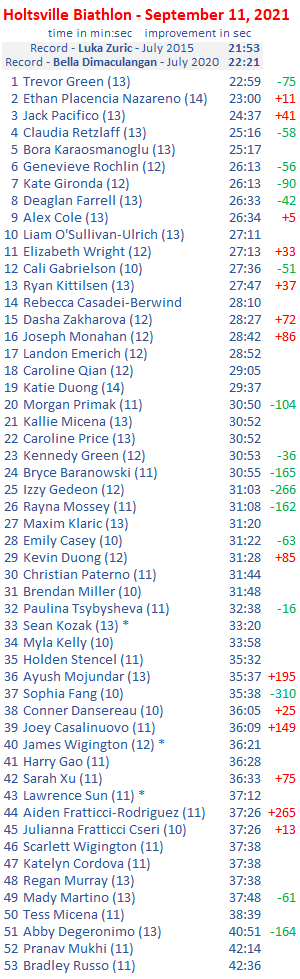 Many did better than the July 29 Biathlon, but some added time, proving that taking 4 weeks off from practice in August is affecting the conditioning. So, Luka's and Bella's records will stand for another year!