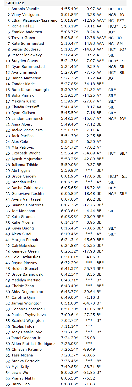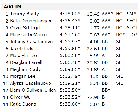 New qualification times: 1 Senior Mets cut, 1 Eastern Zone Age Group Champs cut, 5 JO cuts, 8 Holiday Classic cuts, 3 Holiday Classic Bonus cuts, and 13 Silver cuts.