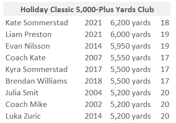 In the last Holiday Classic of their age group career Kate Sommerstad raced 6,200 yards and Liam 6,000 yards and are now members of the 5,000-Plus Yards Club! In table below a list of the Iron Men and Iron Women of TVSC, who all competed 17 to 20 times in the toughest events at this meet. Liam was the most versatile by winning the 1,650 on Thursday night and finishing 3rd in the 50 free and making the Top-8 in 8 out of 9 events and swimming 14 best times in 16 individual races!