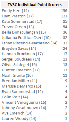 Antonio Vavalle (2), Vinny Vinciguerra (4), Makayla Lee (2), Timmy Brady (2), Hunter Emerson (2), Trevor Green (2), Emily Herr, and Frankie Andersen.