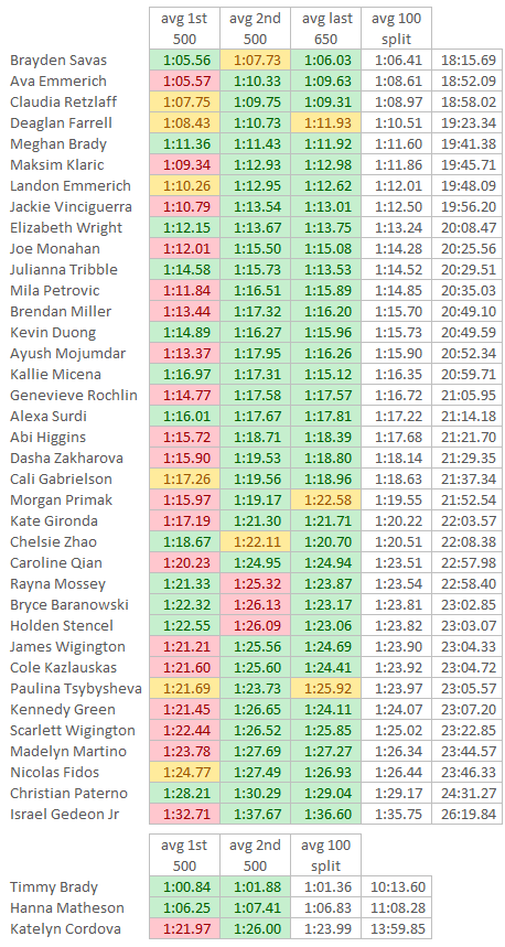 29 swam the 1,000 free and 15 swimmers swam the 1,650 for the first time.