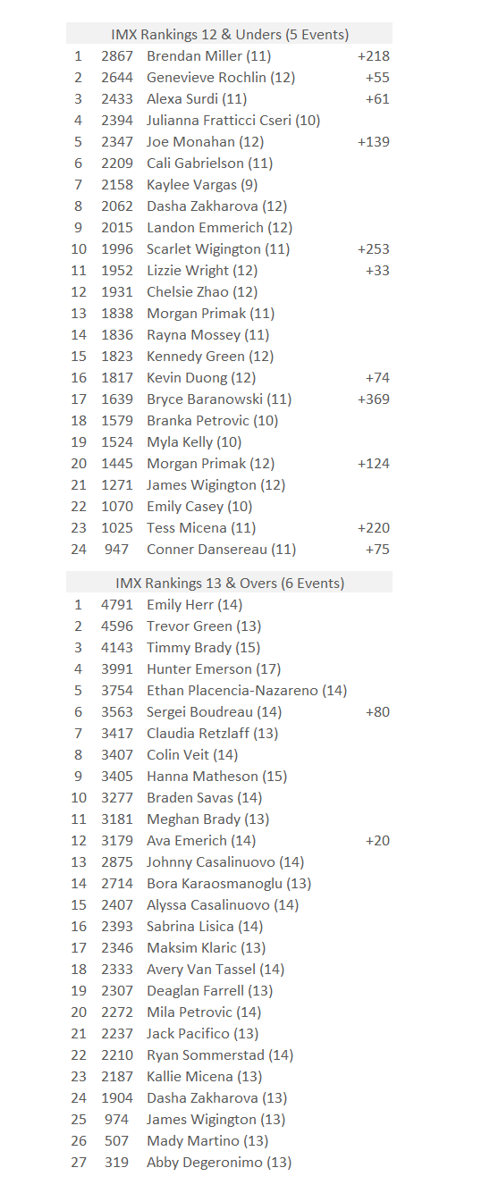 Bryce Baranowski added 369 points to his IMX score, Scarlet Wigington added 253, Tess Micena added 220 and Brendan Miller 218.