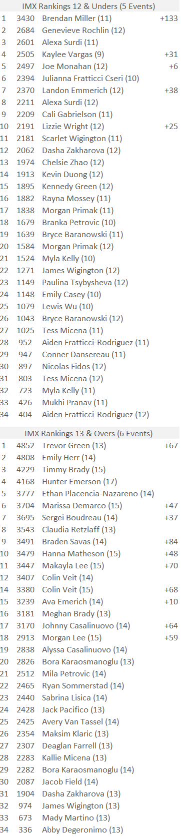 IMX Rankings After 14&U JOs and 15-18 Age Group Challenge