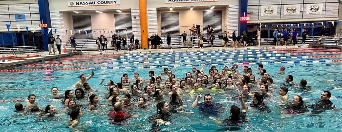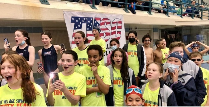 East Meadow, NY – On Sunday night at Eisenhower Park the PA announcer began reading off the team scores at the conclusion of the Suffolk County Championship competition and eventually arrived at the words TVSC has been waiting to hear for a long time: “In 1st place with 3,427 points, YOUR 2022 Suffolk County Champions – Three Village Swim Club!”