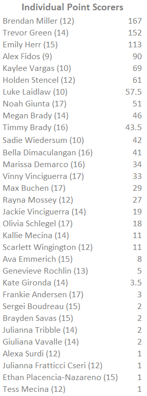 Brayden Savas (3), Sergei Boudreau, Thomas Miele, Richie Hall III (2), Meghan Brady (2), Frankie Andersen (2), Trevor Green, Ethan Placencia-Nazareno (2), Marissa DeMarco, Jackie Vinciguerra, Olivia Schlegel (2), and Bella Dimaculangan.