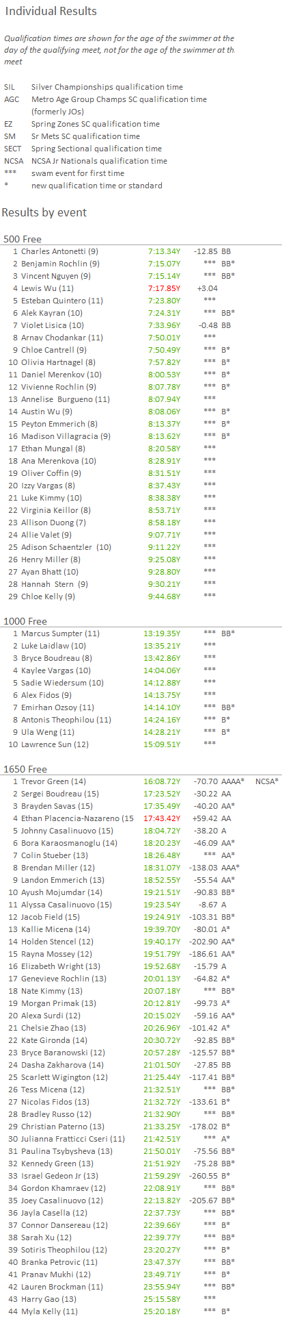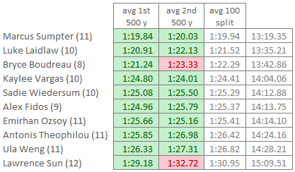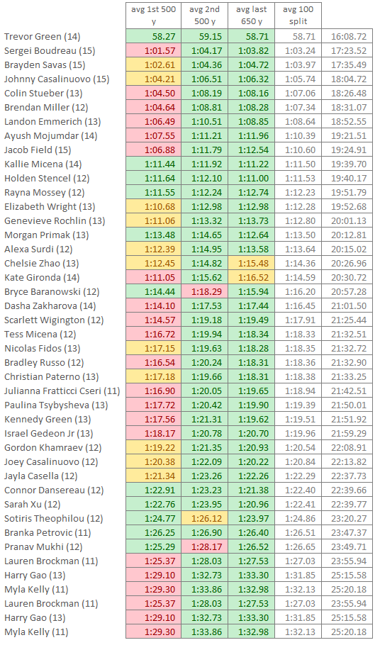 The charts below show the how well the swimmers swam their 1000 or 1650 race, All green means good splits. The goal should be that the splits per race section are withib 1 second. The 1000 free swimmers did quite well, but like every year, many mile swimmers started their race too fast and could not maintain that pace.