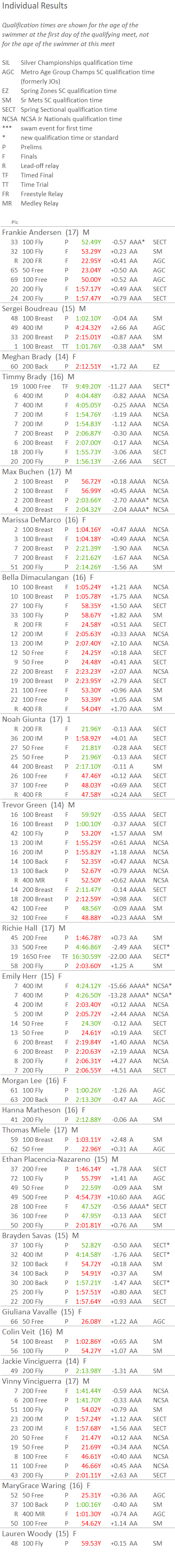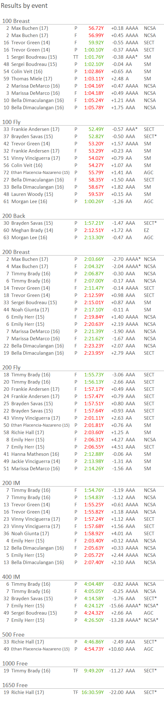 On Saturday, Emily Herr placed 4th in the 200 IM clocking the fastest time by a 15-year-old swimmer in 2:03.40. Bella Dimaculangan finished in 12th place with a 2:05.63. Timmy Brady finished 7th place in the 200 IM with a new personal best of 1:54.76. Richie Hall III qualified for sectionals in the 500 Free touching the wall with a 4:46.86, nearly 2.5 seconds faster than his time at Section XI County Championships only 1 week earlier. The 400 Medley relay team of Trevor Green (52.50), Max Buchen (56.98), Noah Giunta (50.14) and Vinny Vinciguerra (46.39) broke the 2017 Boys Open 400 Medley Relay Record from Ryan Kaplan, David He, Jake Vecchio, and Nick Bogush by 2 sec - 3:26.0. This time is also faster than the 15-18 400 Medley Team Record.