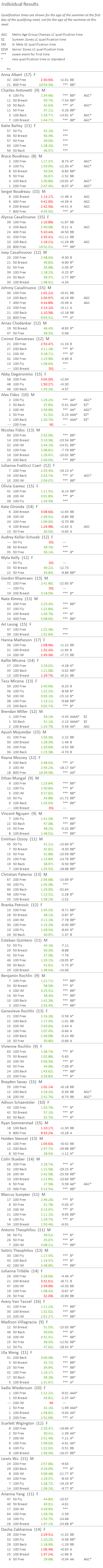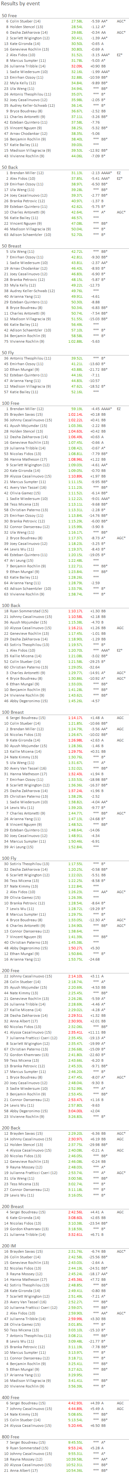 Charles Antonetti (4), Bryce Boudreau (4), Colin Stueber, Alex Fidos (2), Julianna Fratticci Cseri, Brayden Savas (2), and Dasha Zakharova. Mostly Best Times: Ethan Mungal, Connor Dansereau, Audrey Keller-Schwab, Myla Kelly, Gordon Khamraev, Kallie Micena, Brayden Savas, Holden Stencel, and Kate Gironda.