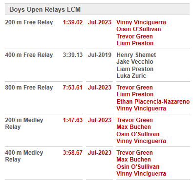 The men's 800 Free Relay team of Trevor Green (1:58.96), Liam Preston (1:56.30), Ethan Placencia-Nazareno (1:58.89) and Vinny Vinciguerra (1:59.46) clocked a 7:53.61 to absolutely shatter the old team record by 6 seconds.