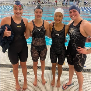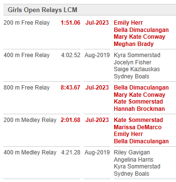 The women's 800 Free Relay team of Bella Dimaculangan (2:11.36), Mary Kate Conway (2:08.43), Hannah Brockman (2:14.53) and Kate Sommerstad (2:09.35) clocked a 8:43.67 to establish a new TVSC Open team record.