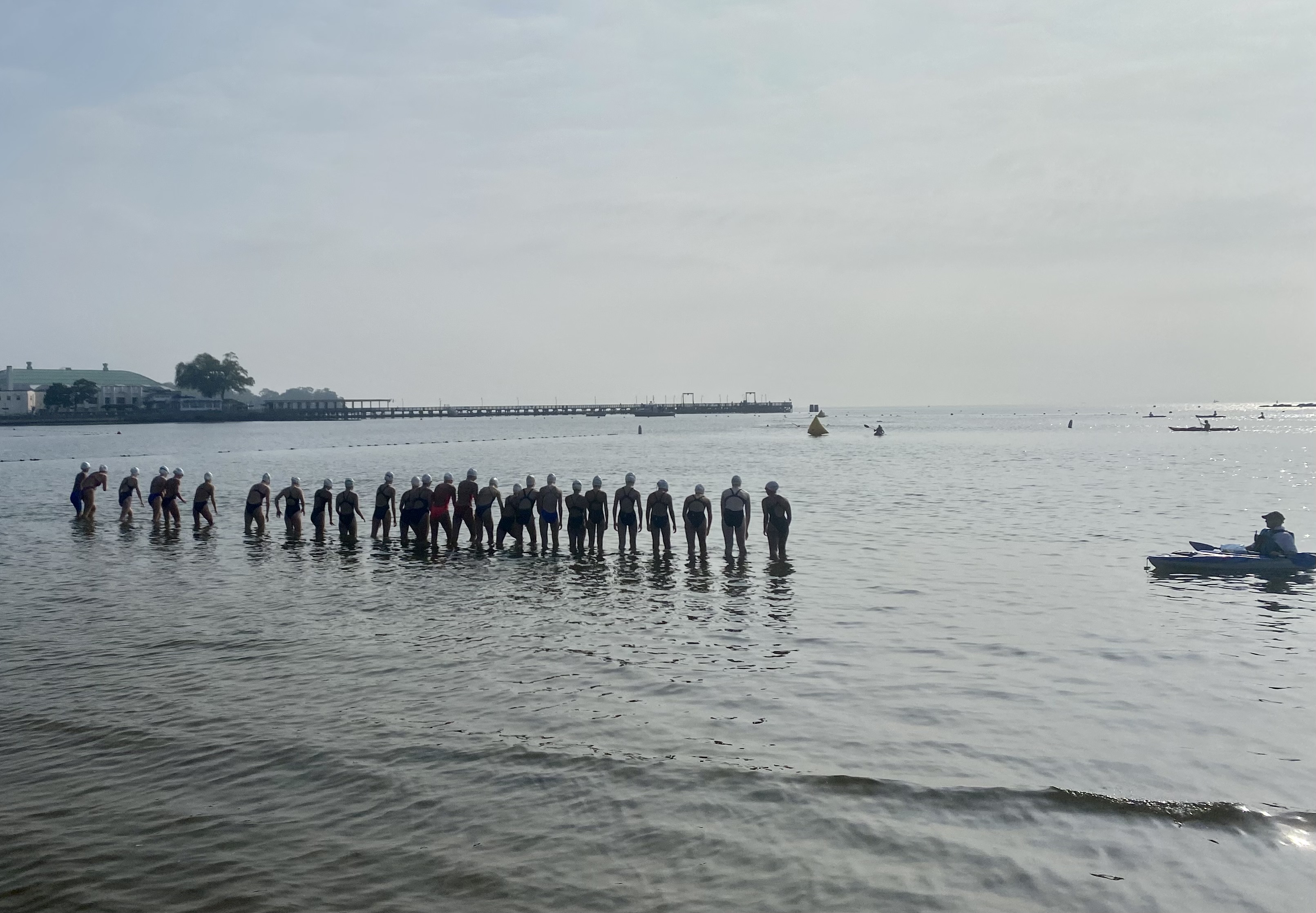 7:00 AM Open Water Champs venue at Rye Beach - swimmers are warming up