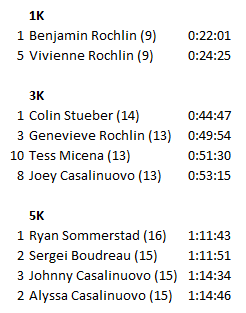 Genevieve (13) 3K - 4th place, Vivienne (9) 1K - 5th place, Tess (13) 3K - 10 place, Benjamin (9) 1K - 1st place, Alyssa (15) 5K - 1st place, Joey (13) 3K - 6th place, Sergei (15) 5K - 2nd place, Johnny (15) 5K - 3rd place, Colin (14) 3K - 1st place, Ryan (16) 5K - 1st place