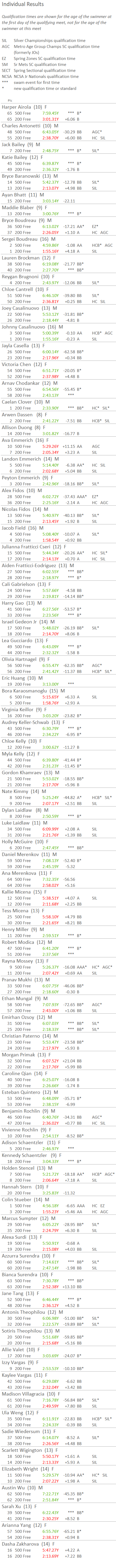 New qualification times:2 Eastern Zone Age Group Champs cuts, 6 JO cuts, 3 Holiday Classic cuts, 7 Holiday Classic Bonus cuts, and 21 Silver cuts.
