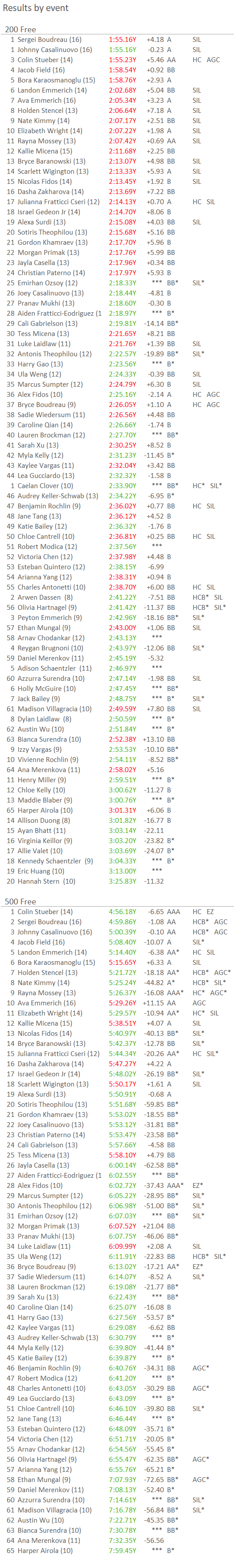 84 athletes raced either the 200 free or 500 free with 200 free split and swam 99 best times.