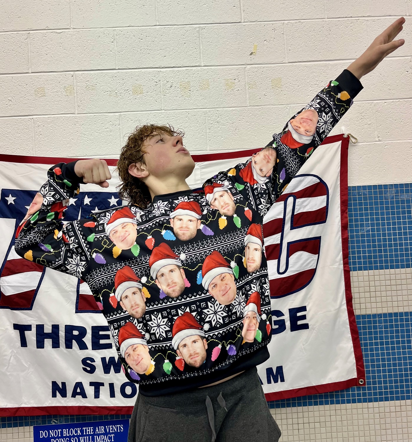 Colin showing off his ugly Christmas sweater on the Ugly Xmas Sweater themed Friday night's finals