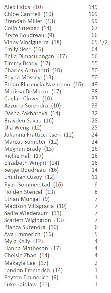 Holden Stencel (3), Timmy Brady (2), Sergei Boudreau, Ryan Sommerstad, Brayden Savas, Alex Fidos, Rayna Mossey (2), Colin Stueber (2), Scarlett Wigington, Dasha Zakharova (2), Emily Herr (2), Colin Veit, Marissa DeMarco (2).