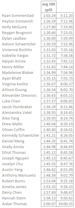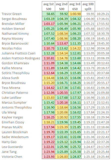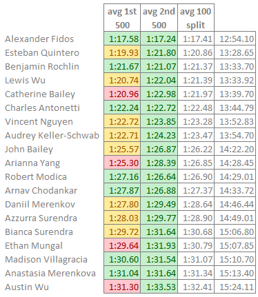 Evenness of 1650 free race (many swimmers went out too fast - yellow or red background)