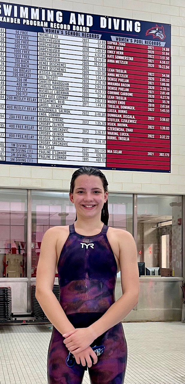 Rayna (13) right after swimming a Stony Brook University pool record in the 1650 free:18:45.13 (that empty row on the new record board).