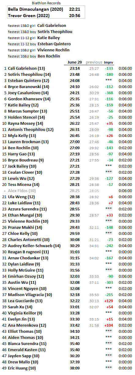 Joey improved his time by 368 seconds or over 6 minutes since last summer, Austin over 5 minutes, Audrey over 4 minutes, Madison and Ben by 3 1/2 minutes, and Sotiris by 3 minutes!