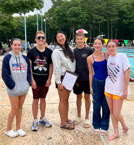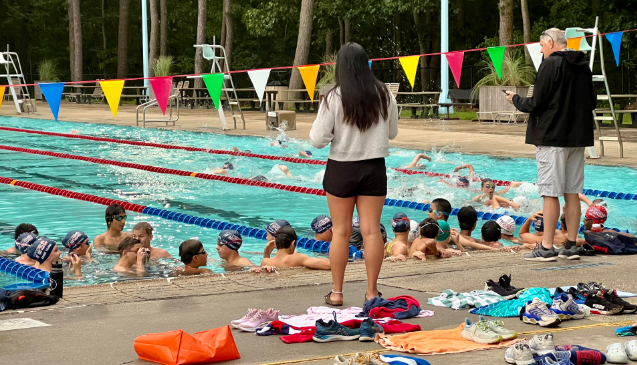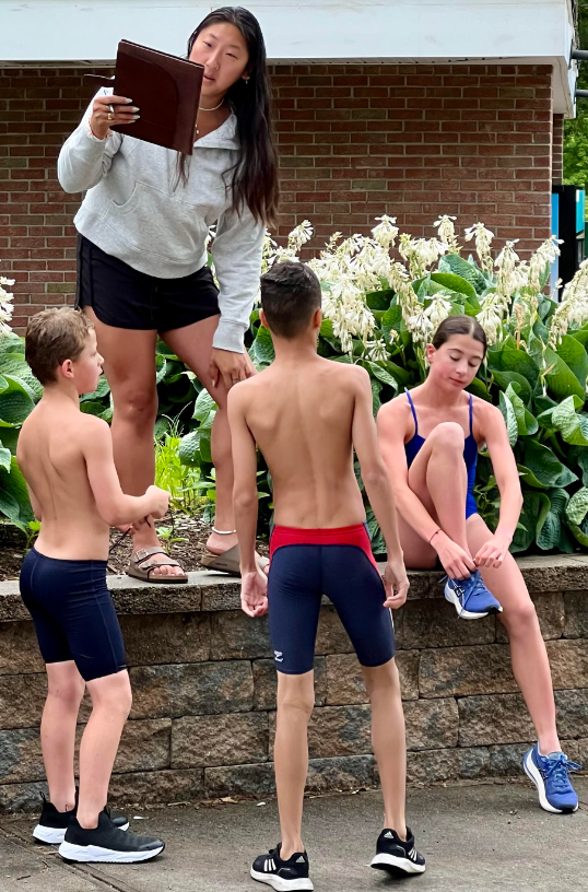 Coach Rita at the finish line with swimmers already finished
