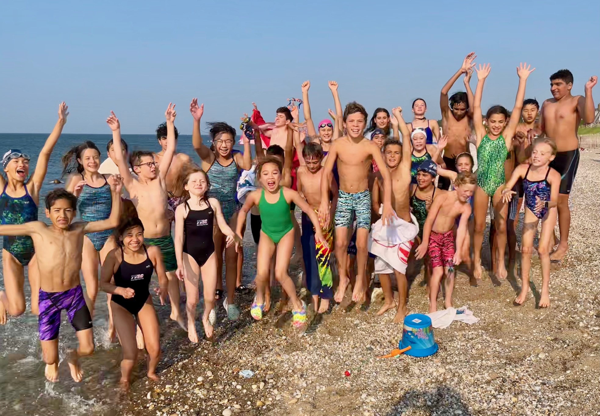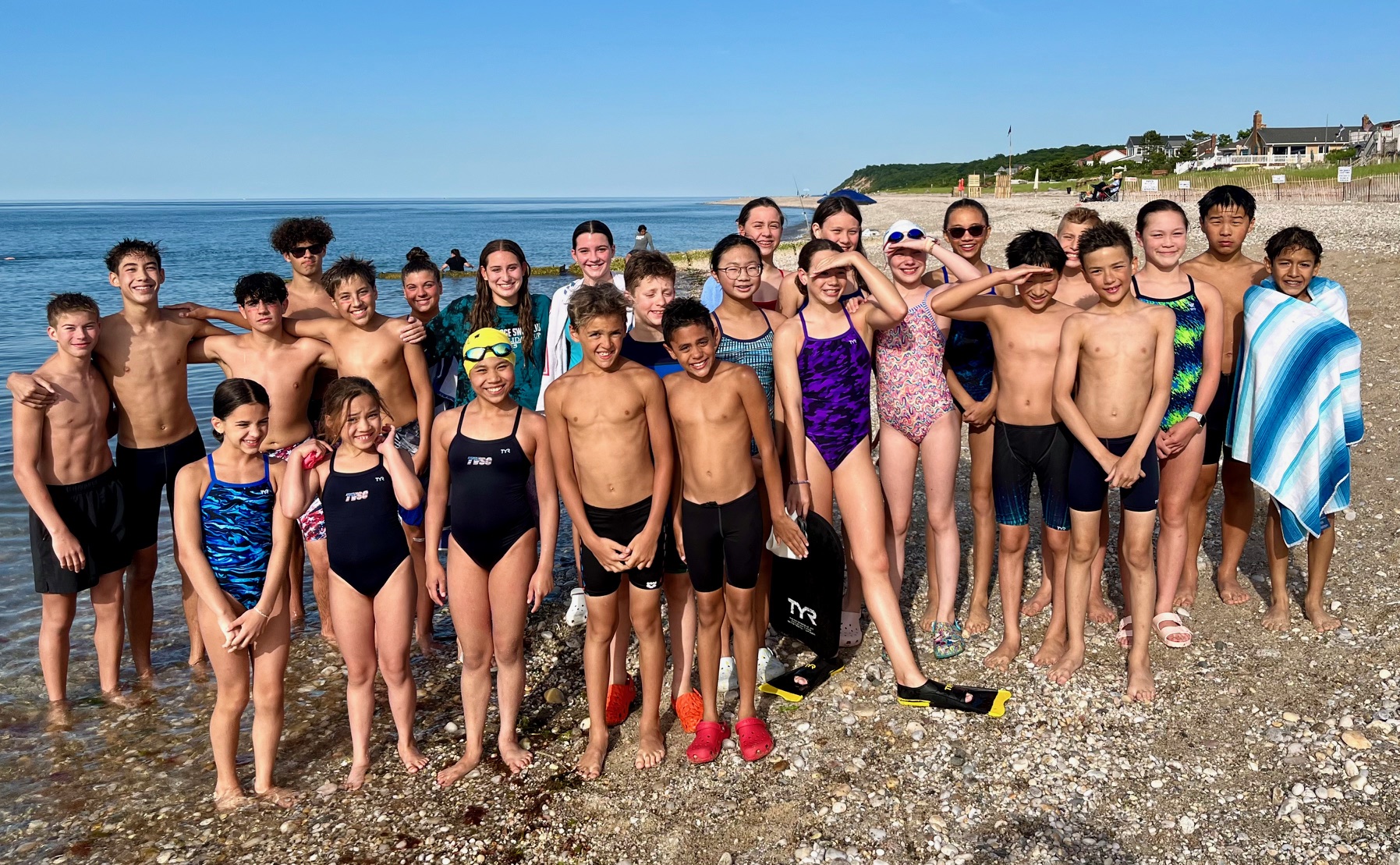 Cedar Beach July 2 - The 26 Junior and senior swimmers at the first Cedar Beach open water practice.