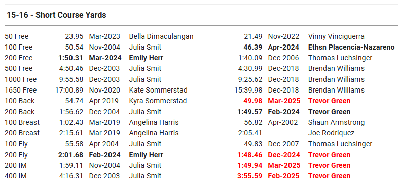 | 24 | -- | 200 IM | P | 1:58.25Y | -1.82 | AA | SECT* |