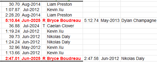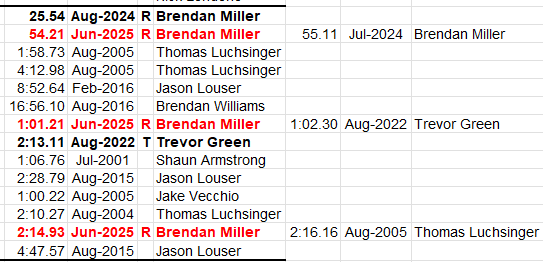 In the Saturday afternoon session, Brendan Miller broke the 2005 or 20-year old 13-14 200 IM long course team record from Thomas Luchsinger by 1.3 sec: 2:14.93. Less than an hour later, he also broke Trevor Green's 2022 13-14 100 Back team record by 1.1 sec: 1:01.21. In the Sunday morning session. Brendan broke his own 100 Free record from last summer by 0.9 sec: 54.21 Congratulations Brendan!