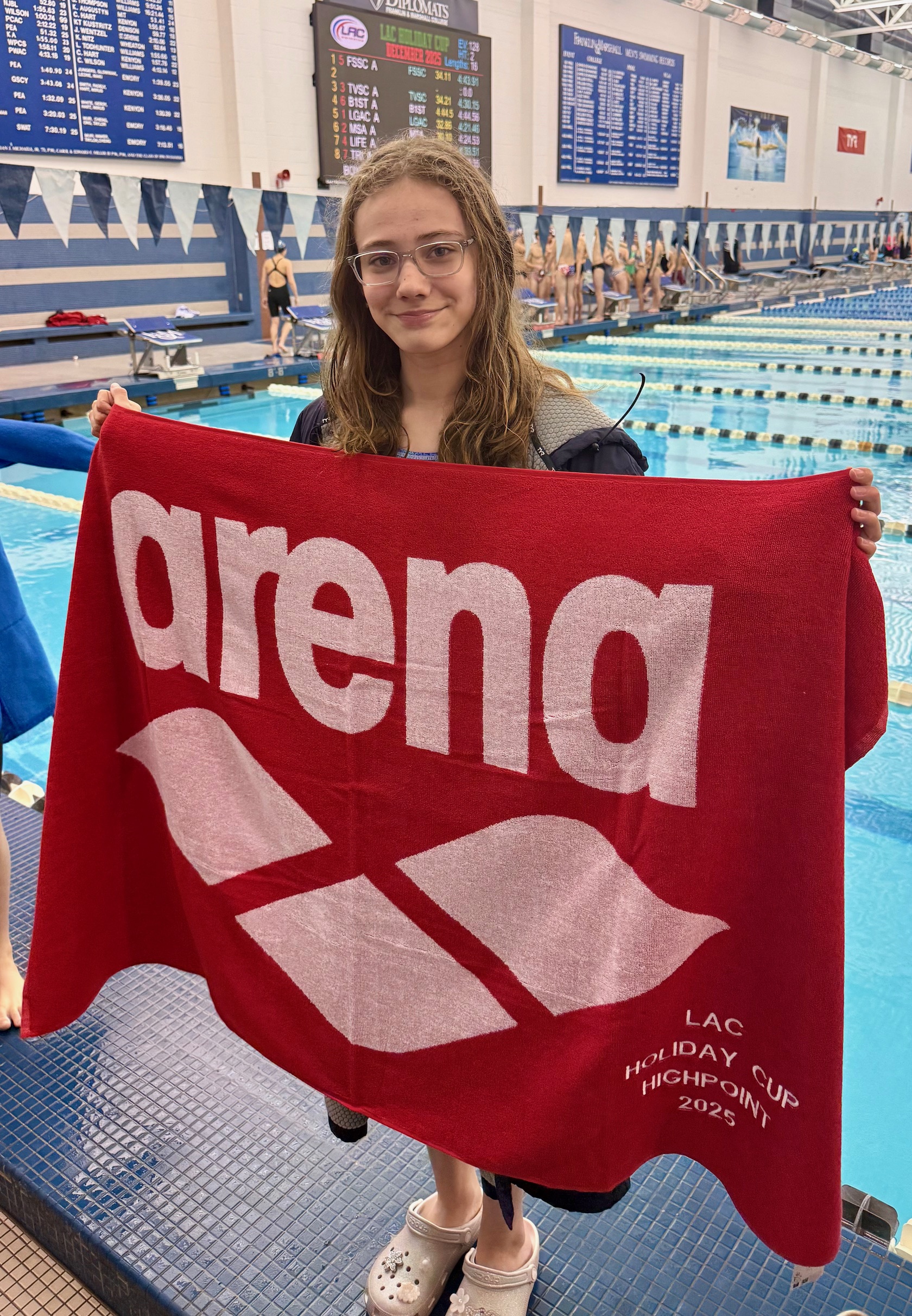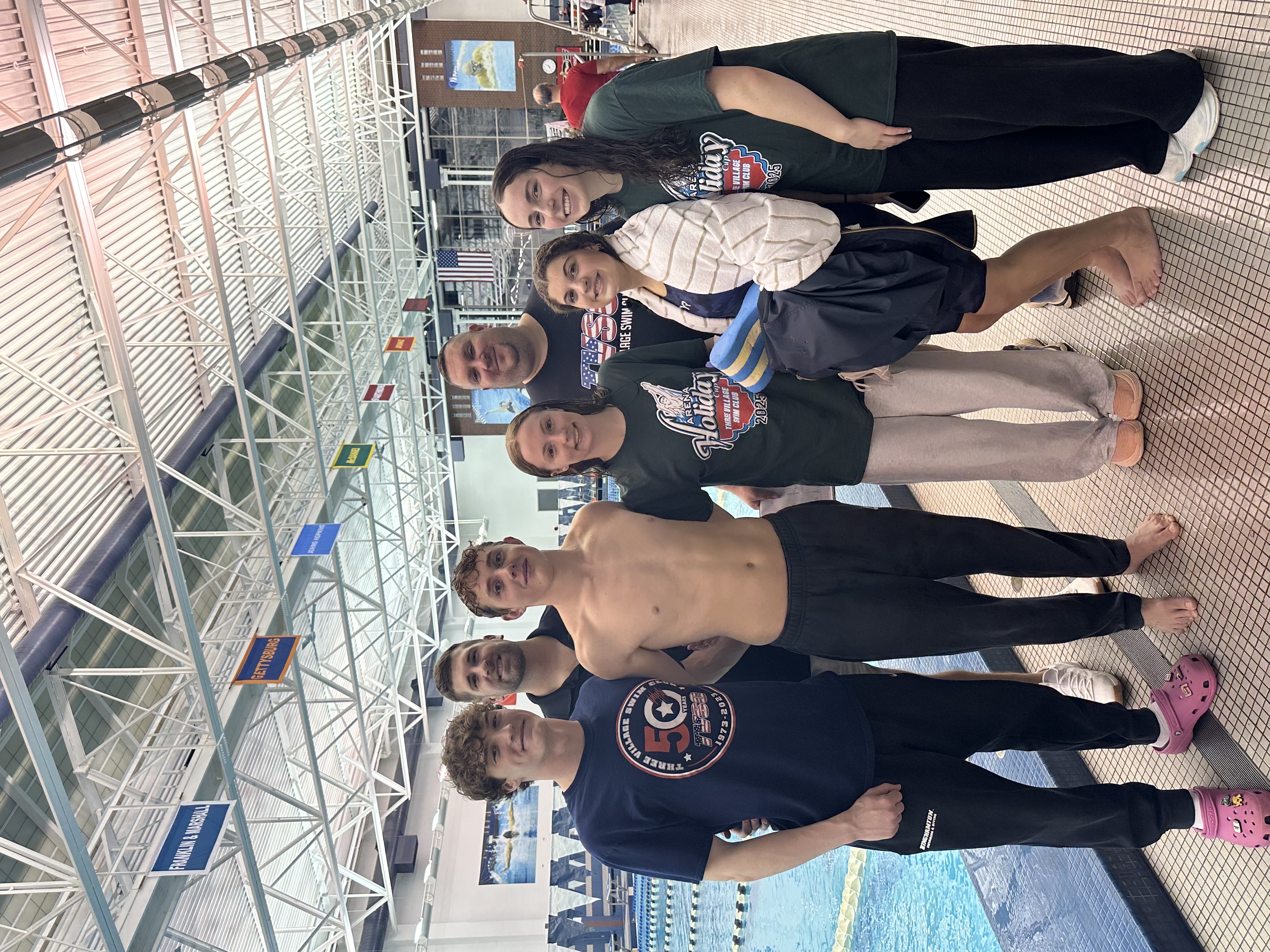 Fifty‑four TVSC swimmers, along with their families and coaches Mark, Chris, Joe, Peter, Mike, Jason, and Dan, traveled to Lancaster for the 27th or 28th Annual Holiday Cup at Franklin & Marshall’s Kunkel Aquatic Center. This marked the 26th time TVSC has competed at the Holiday Cup. The meet was not held in 2020 due to the pandemic, and in 2021 it was hosted by Keystone Aquatics in Carlisle, PA.