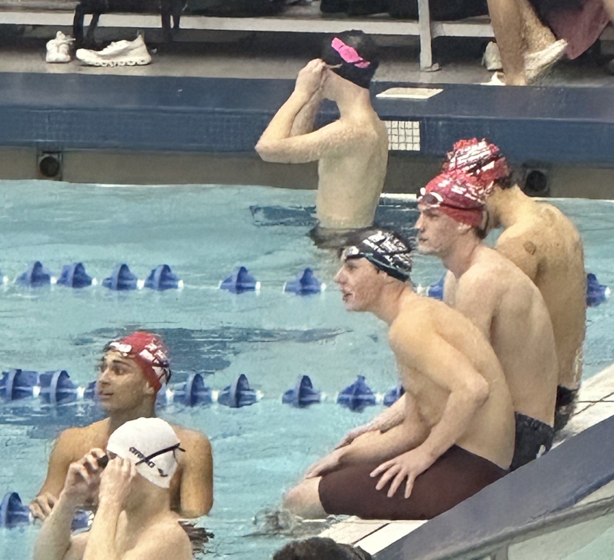 Trevor, Colin, Liam and Johnny in the warm-up lanes watching a teammate competing