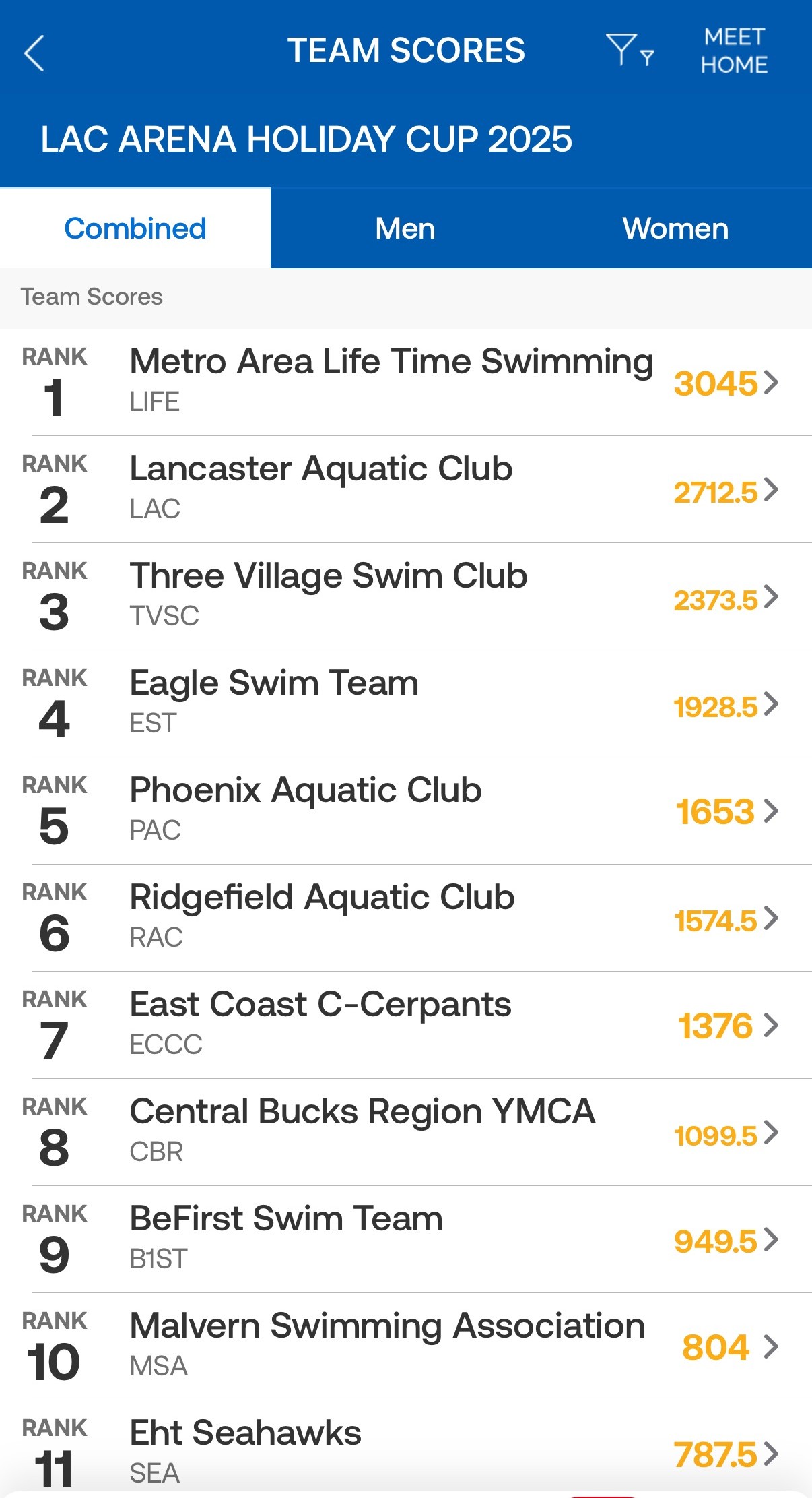Mega team LIFE, with more than 90 swimmers, captured the team title for the third consecutive year. The host team, LAC, placed second, while TVSC earned a strong third‑place finish — an improvement of one spot from last year.