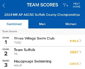 TVSC swimmers always do well at home meets. This weekend's Silver Championships at the Ward Melville HS pool was no exception: 81 swimmers raced 315 times and swam 196 best times. Total time improvement 548 seconds, or more than 9 minutes. New time standards: 2 'AAA' times, 13 'AA' times, 32 'A' times, 24 'BB' times, and 1 'B' time. New qualification times: 2 Eastern Zone Age Group Champs cuts, and 60 Jr Mets (formerly JOs) cuts, More Highlights All Best Times: Esteban Quintero, Azzurra Surendra, Izzy Vargas, Austin Wu,...